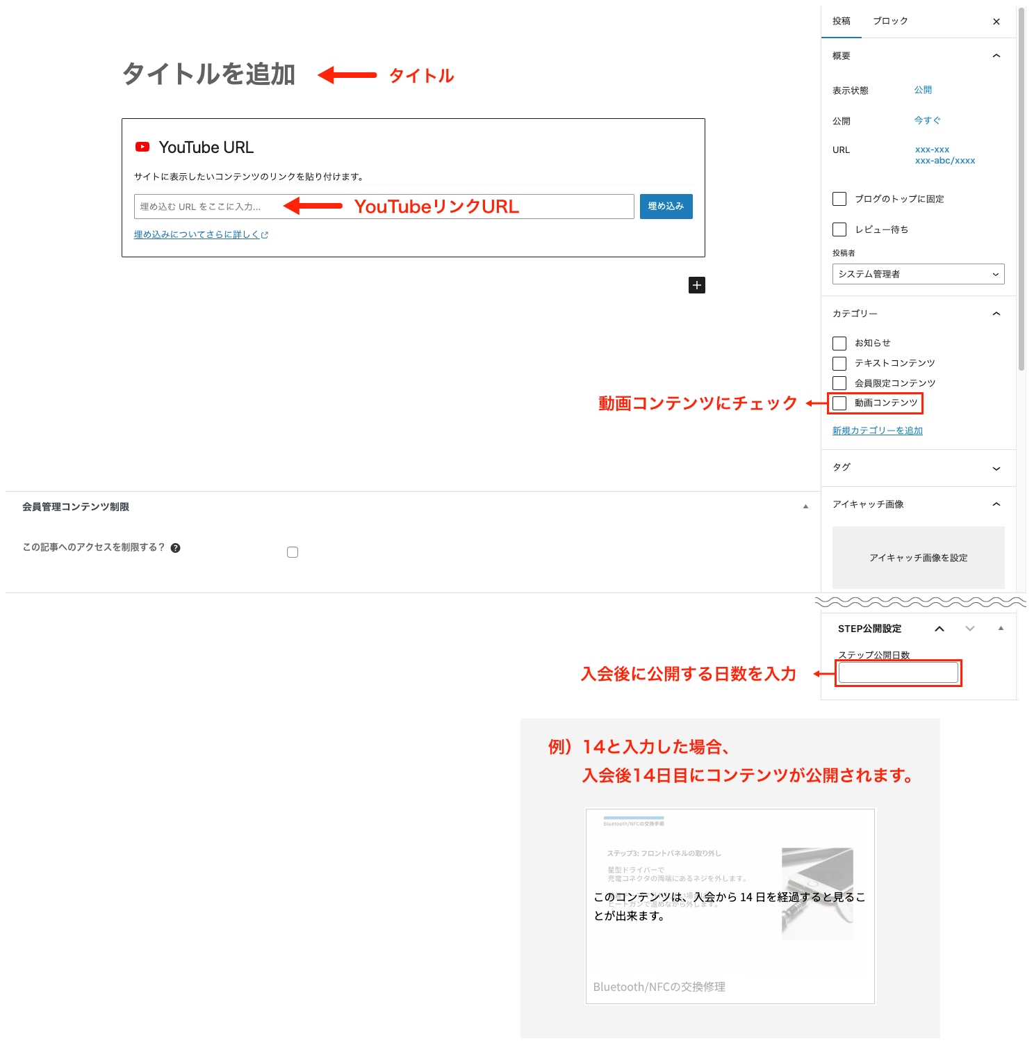 ステップ公開する場合は、STEP公開設定にステップ公開日数を入力して設定します。(例:14と入力した場合は、入会後14日目にコンテンツが公開されます)