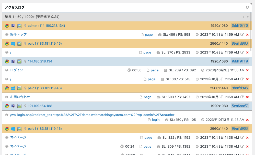 現在、リアルタイムでアクセスしているユーザーを表示します。背景色がオレンジ色が管理者、緑色が会員、水色が非会員です。それぞれがどのページにアクセスしたのかも表示されます。これにより現在のアクセス状況を把握することができます。
