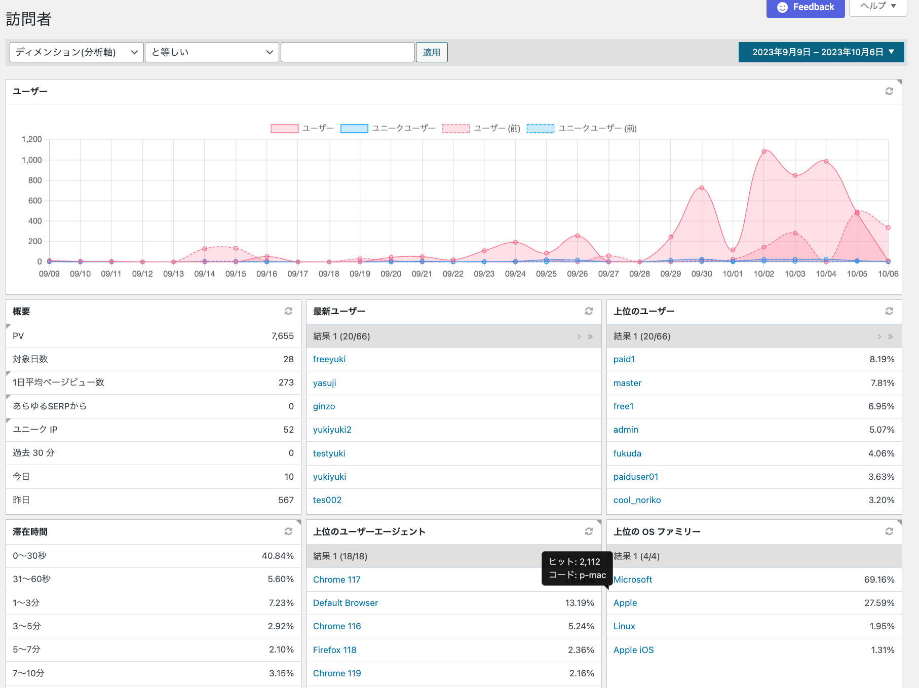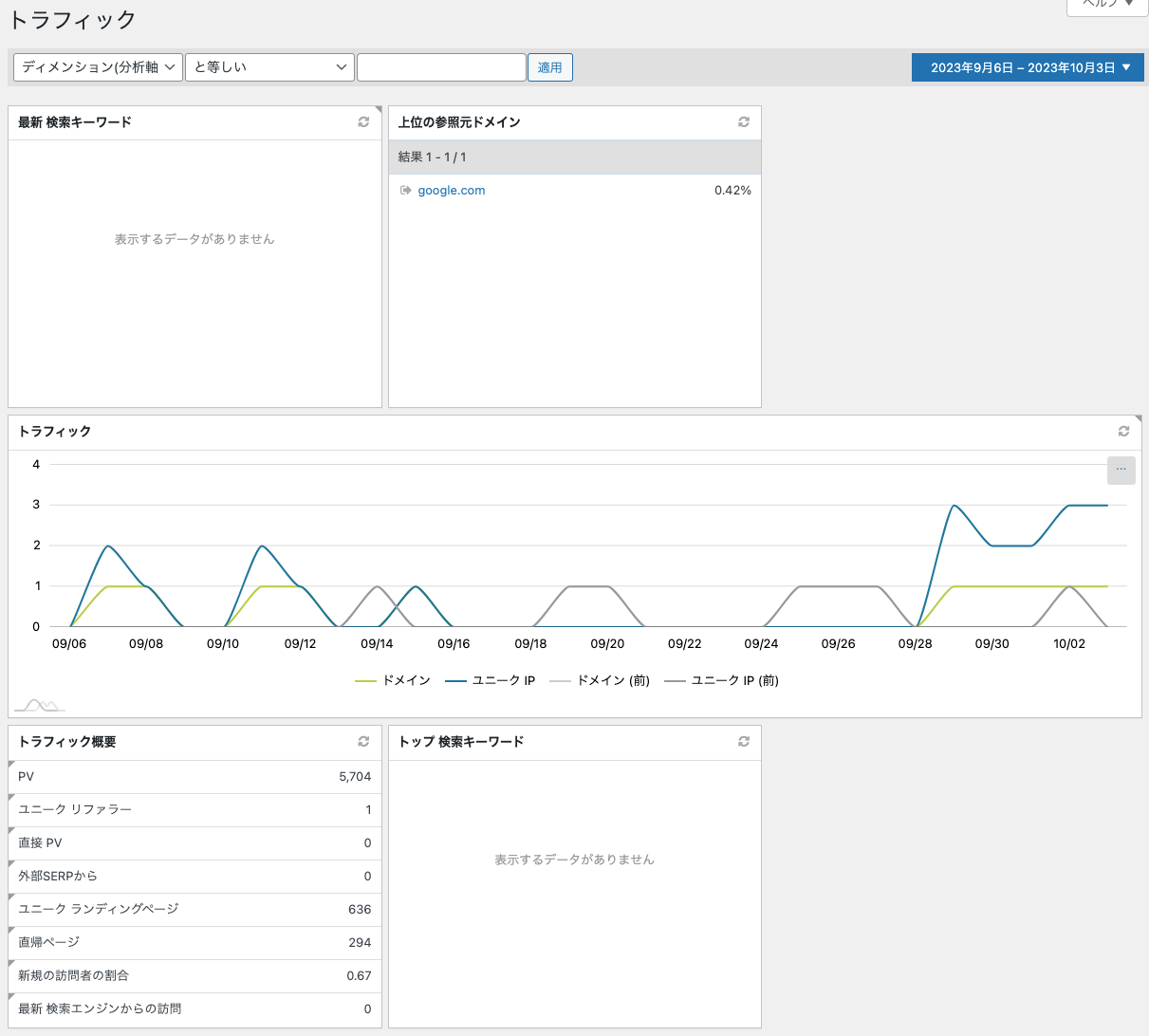 訪問者、サイト解析、トラフィックのデータから主要な項目を表示します。サイトの状態を把握するマーケティングに必要なデータはだいたい表示されています。集計期間を右上の青いドロップダウンリストで変更可能です。